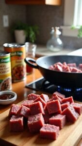 Sear Beef Until BrownedSearing the beef until browned is an essential step that enhances the flavor of your dish. It's not just about cooking; it's about infusing every bite with that deep, savory goodness.When you use proper beef searing techniques, you create a beautiful crust that locks in juices, turning ordinary beef tips into something extraordinary.So, heat up your skillet over medium-high heat and drizzle in some olive oil. Once it shimmers, season your cubed beef liberally with salt and pepper.Now, here's where the magic happens: place the beef in the skillet without overcrowding it. Let it sizzle and develop that gorgeous brown color for about five minutes, turning it occasionally.Don't rush this step—patience pays off!You might be wondering, how does this affect the final dish? Well, browning the beef is one of those flavor enhancement tips that transforms your meal from bland to grand.That caramelization adds a layer of complexity, making your creamy mushroom gravy even more irresistible. Trust me, you won't want to skip this vital step in your cooking journey!
