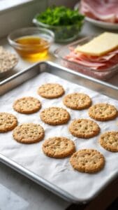 Arrange Crackers on Baking SheetWith the oven preheated to 350°F, it's time to arrange the crackers on the baking sheet. This is where your delicious journey begins!Grab your whole-grain crackers and lay them out in a single layer on the prepared baking sheet. You want to create a neat cracker arrangement that allows each piece to shine without crowding.Imagine each cracker as a tiny canvas, ready for the savory masterpieces they'll soon hold.Think about it: if you stack them too close, the toppings won't bake evenly, and we're aiming for that perfect melty goodness, right?Take a moment to guarantee that each cracker has a little space around it. It's a small step, but it makes a big difference in the final result.Once you've got them arranged just right, you'll be ready to add the ham and cheese in the next step.
