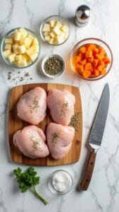 Prepare Vegetables, Season ChickenBegin by thoroughly washing and peeling the carrots, parsnips, and potatoes. Chop these root vegetables into bite-sized pieces, ensuring they're uniform in size for even cooking.Don't forget to dice the onion and mince the garlic cloves – these aromatics will infuse your dish with incredible flavor. As you complete your vegetable preparation, take a moment to appreciate the vibrant colors and fresh scents. Doesn't it make you excited for the meal to come?Now, let's focus on chicken seasoning. Pat the chicken thighs dry with paper towels – this step is essential for achieving that perfect golden-brown sear.Season them generously with salt and pepper, making sure to coat both sides evenly. Have you considered adding a pinch of paprika or garlic powder for extra depth? As you season, think about how these flavors will meld with the root vegetables during the slow cooking process.